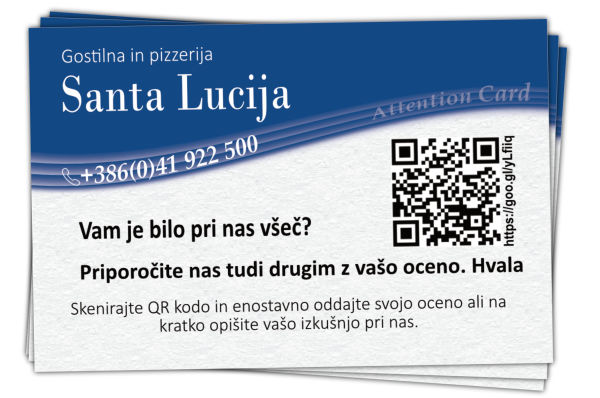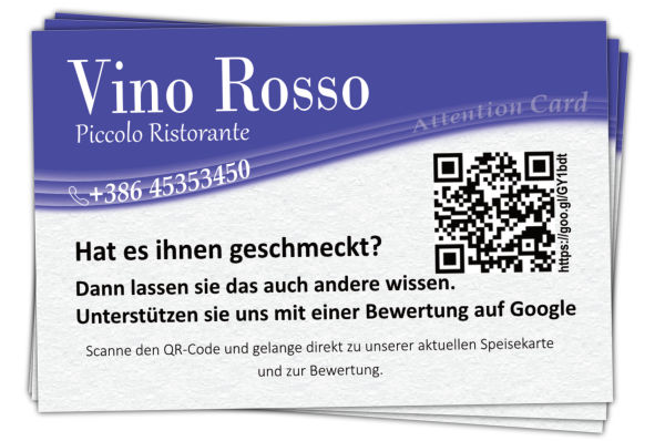 Mit unseren ATTENTION CARD´s in Form von Visitenkarten oder als Tischaufsteller werden Kunden animiert, den darauf abgebildeten QR-Code zu scannen und gelangen so, ganz einfach auf die jeweilige ATTENTION CARD - Landingpage des Betriebes.